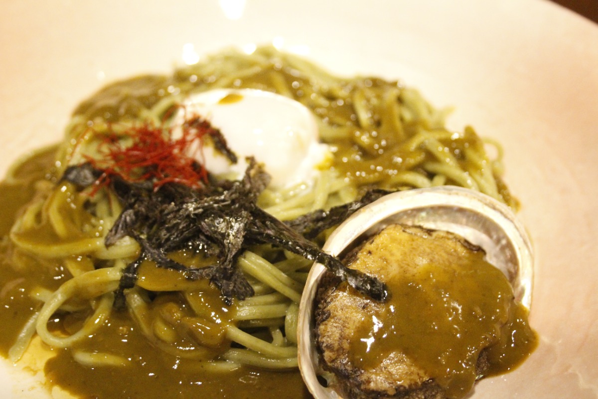 料理が席に届いた瞬間から豊かな香りが広がり、食欲を誘う逸品。「お皿の大きさを考えて席の間隔をあけている」と店員さん。確かに驚くお皿のサイズ感でインパクト大!太くてもっちりとしたワカメの麺、アワビの肝のソース、豚バラと肩ロースのチャーシュー、オニオンチップに味変用のクミンなど、豪華な内容。持ち帰り用のミールキットも販売中。