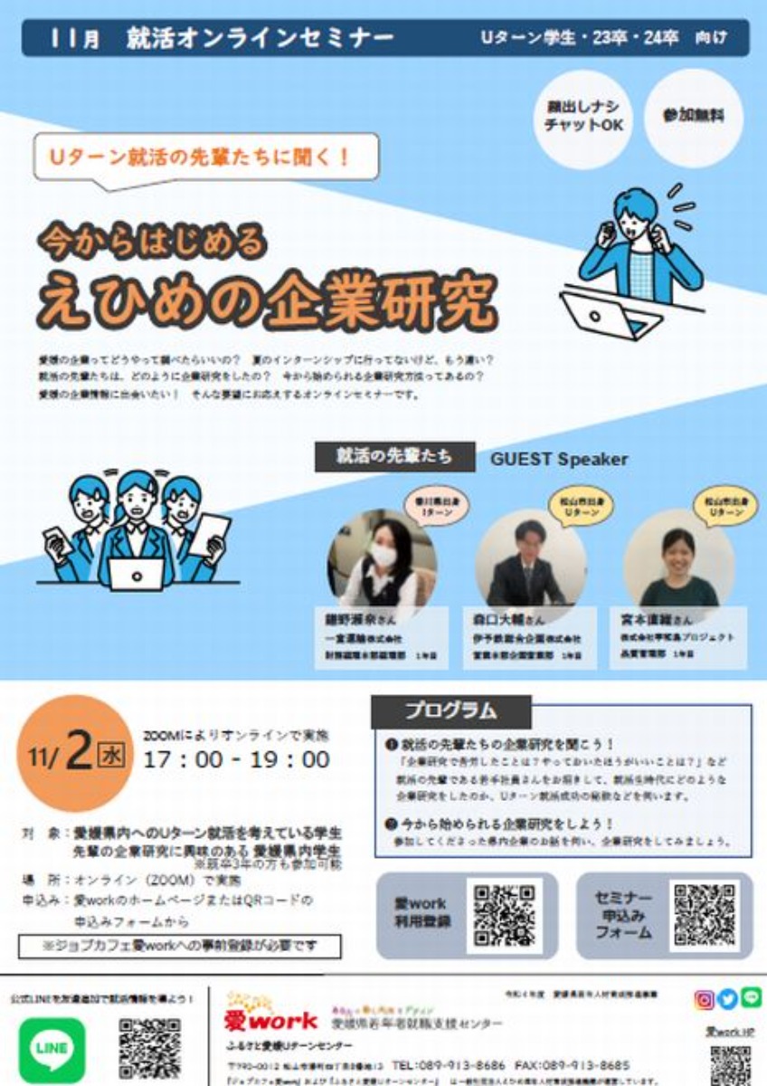 愛媛へのUターンを希望する学生向けのセミナーですが、企業研究について知りたい県内学生や既卒3年以内の方の参加も大歓迎です。参加いただく企業のPRタイムも予定していますので企業研究のためにぜひご参加ください。