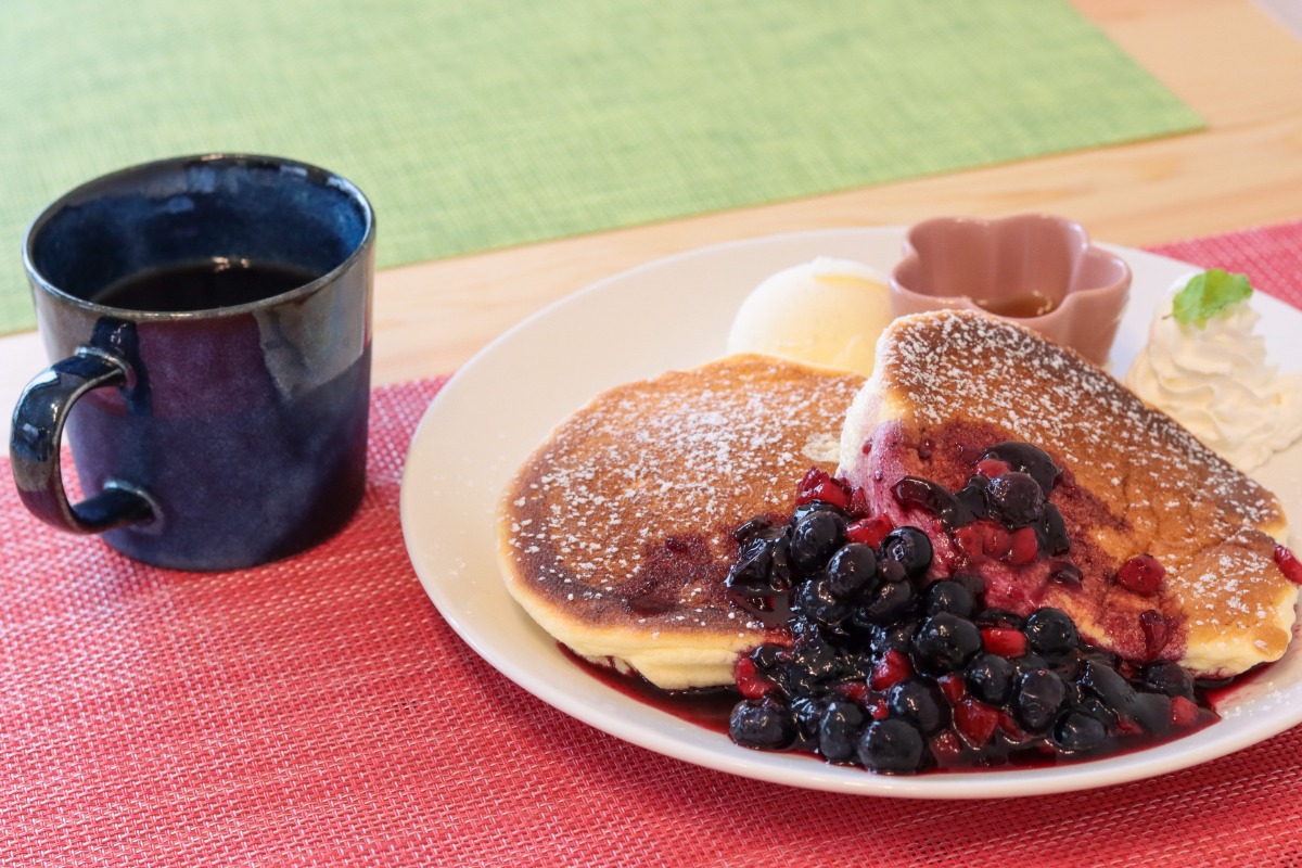 ホッとくつろげる人気のカフェが併設。イチオシは、「ふわふわ! パンケーキ」(800円)。甘さ控えめで、バニラアイス、メイプルシロップ、生クリームとの相性抜群。厚みがあり食べ応え十分。プラス400円でマンゴーかブルーベリーの追加トッピングが可能。