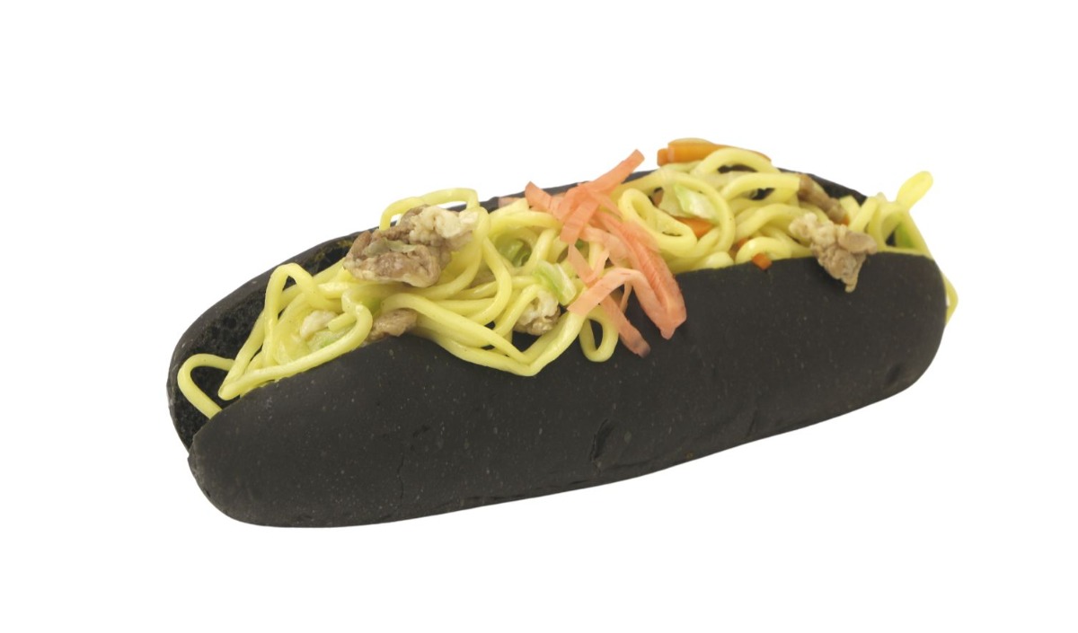 竹炭を使った生地に、塩焼きそばをたっぷりとサンド。色のコントラストが効いた個性派ドッグ。