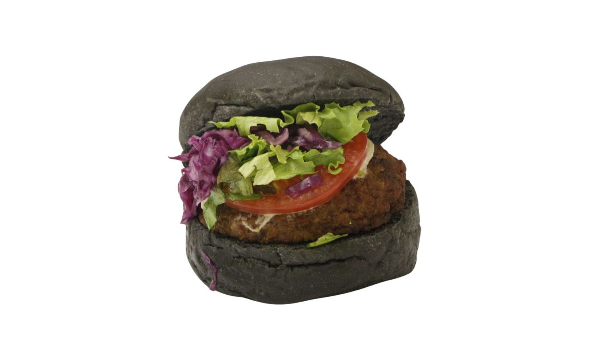 インパクトのある真っ黒なバンズ。ミネラルが豊富とされる竹炭を使っています。5種類の野菜と、ジューシーさを残した手ごねのハンバーグをサンドして、自家製ドレッシングをかけています。ヘルシーながら食べ応えも十分!