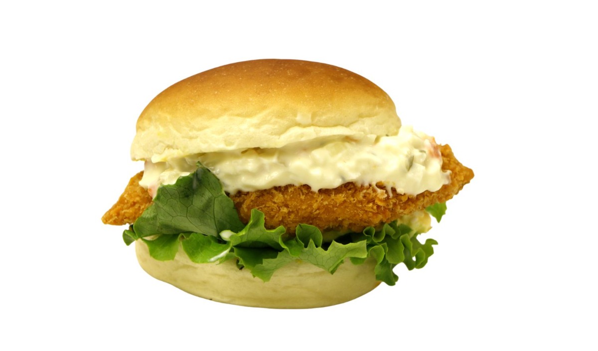 大きな白身魚のフライをサンド。タルタルソースには、たまごサラダを混ぜてたまごの白身や黄身、素材の食感も残しています。