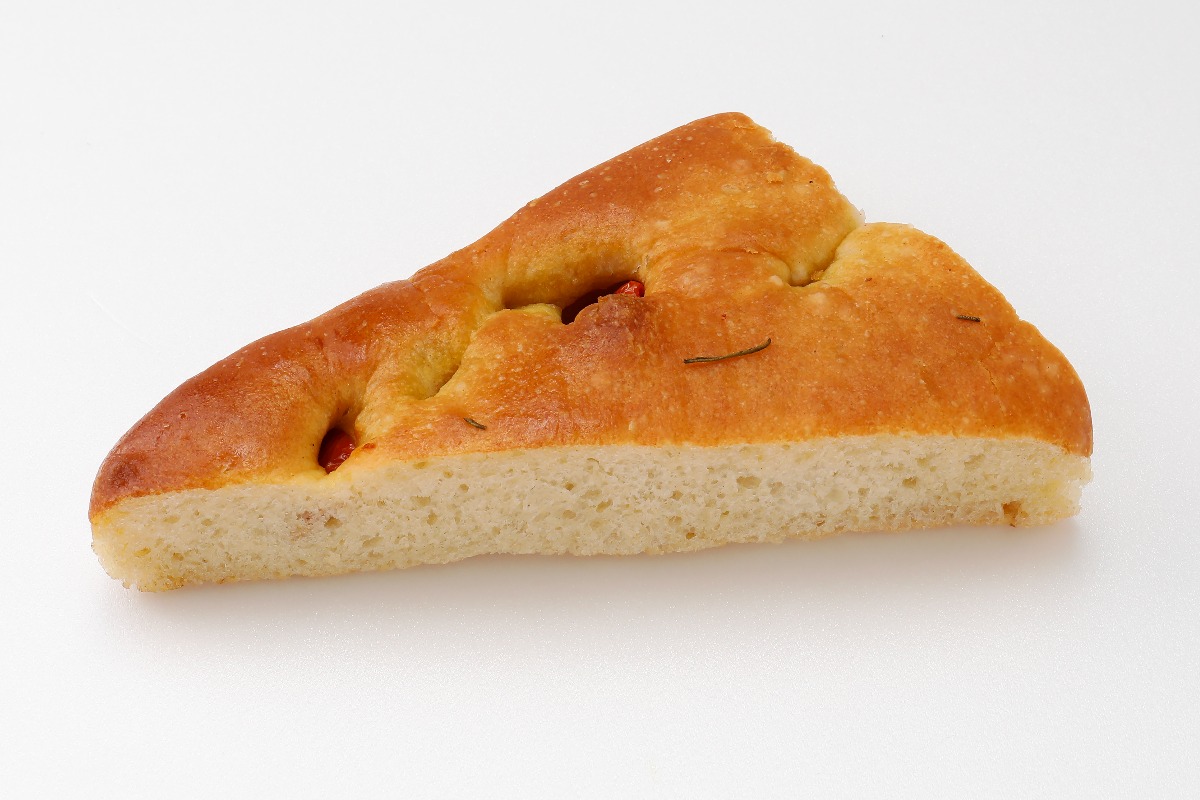 九州産小麦ともち麦を使ったもちもち食感のフォカッチャ。自家製のセミドライトマトを生地にトッピング。ローズマリーの香りがふんわり広がります。