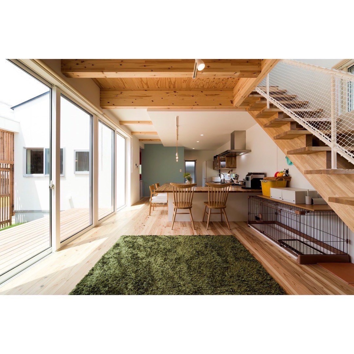 無垢杉の床が住む人だけでなく、ペットのワンちゃんにとっても心地よい空間を叶えた。奥のブルーグレーのクロスが部屋のアクセントに。