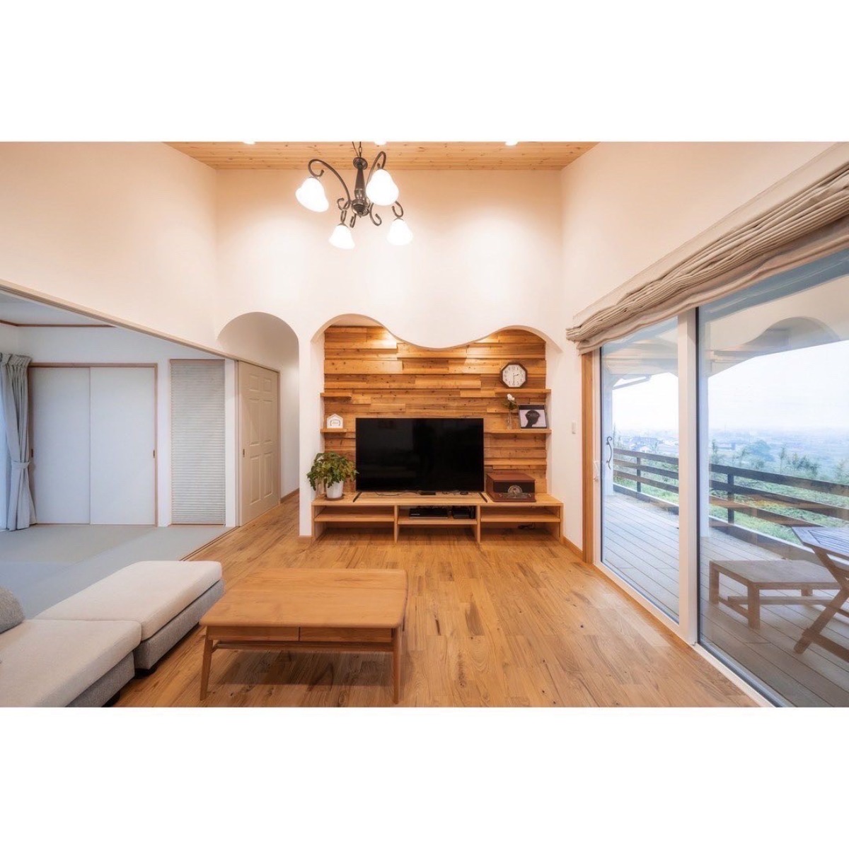 壁面の垂れ壁に施された美しい曲線と壁面に組むように使用した木材のコントラストがアクセントになったリビング。壁のアールは窓から見える景色に合わせている。