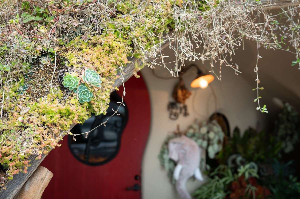 赤い扉とその隣でお客さんを出迎えるゾウさんは、移転前のお店から受け継がれています。