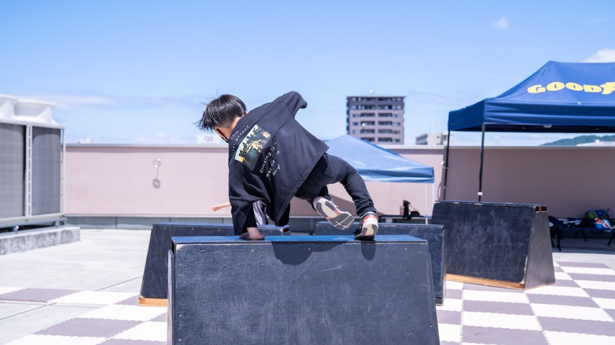 整備された練習施設で、フランスで生まれたトレーニング法の「パルクール」を中心に、世界の若者たちの中で今注目度が高まっているアーバンスポーツを習い事として学ぶことができる。