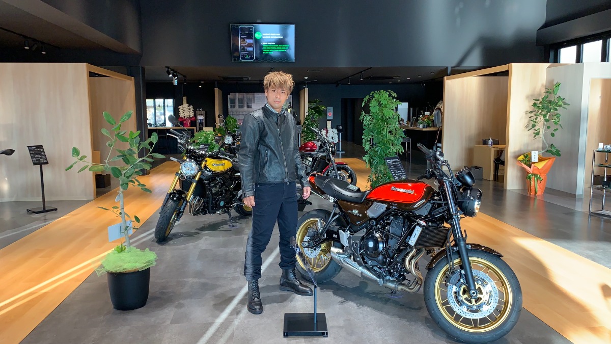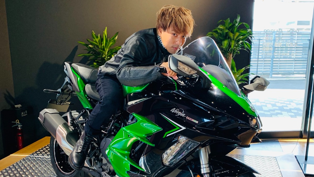 今回、特別にまたがらせて頂いたのは、ハリウッドスター、トム・クルーズが、アクション映画の中で疾走していたことでも有名な「Ninja」シリーズの「H2 SX SE」。バイクとの一体感、バイクの重厚感、フォルム、どれをとってもかっこよさ反則級。僕も、実は、二輪免許を所有していますが、いつかこのバイクを乗りこなせる男になってみせます!!