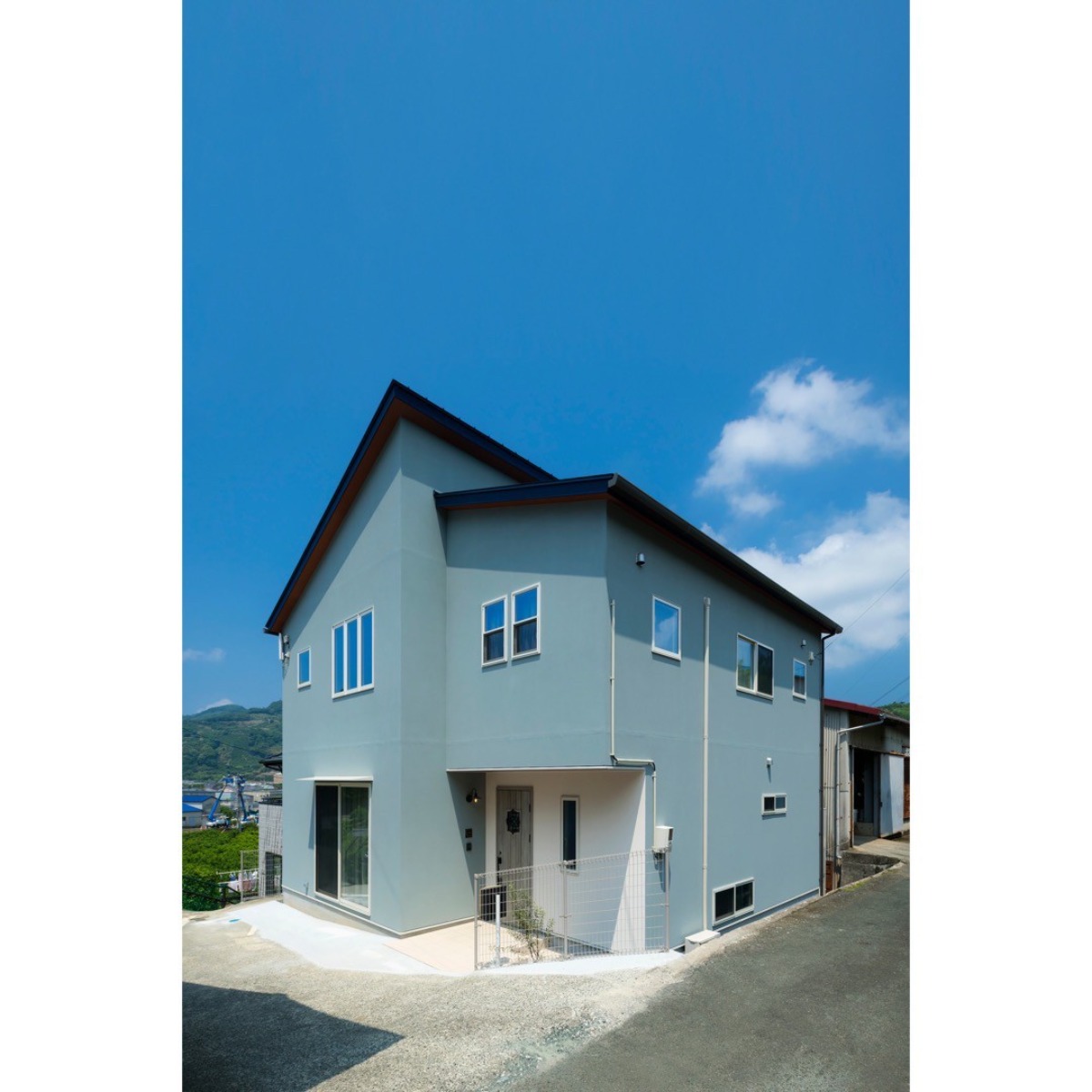 ブルーグレーの外壁と、玄関まわりの塗壁やサッシに採用したホワイトの色合いが爽やか。明るく開放感のあるデザインに