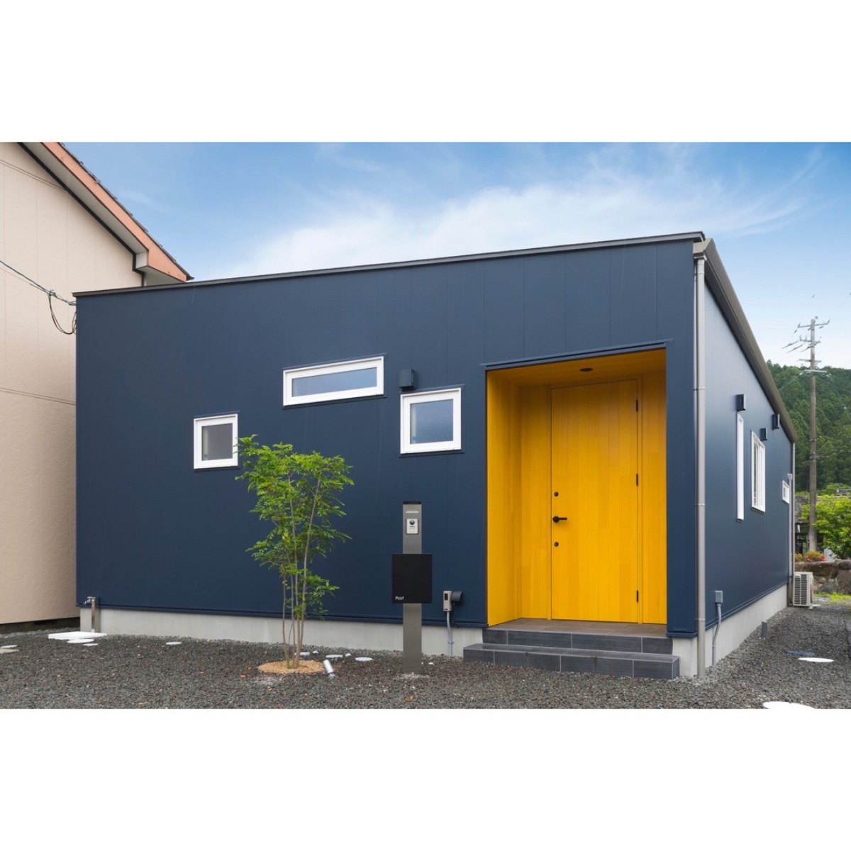 ネイビーの外壁に玄関まわりのイエローが映えるコントラストが目を引くデザイン