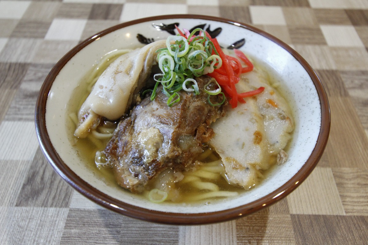 看板メニューの「美ら島そば」はテビチ(豚足)とソーキ(豚のあばら肉)、沖縄県伊江島産の島カマボコがのったボリューム満点の一品。お好みでそばにかける、島とうがらしを泡盛に付け込んだ調味料「コーレーグース」は販売もしているので気に入ったら買って帰ろう。