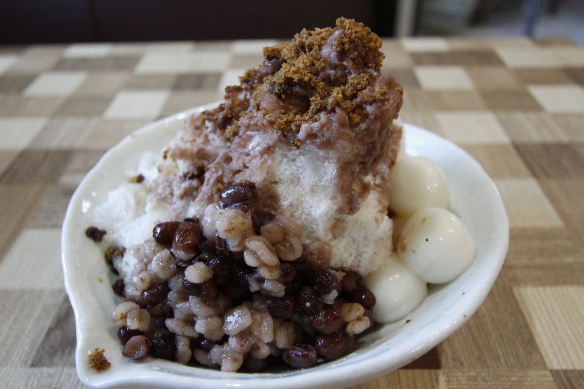 なんと、沖縄では一般的に「ぜんざい」といえばかき氷のこと!白玉がのったかき氷に、おしること黒糖がかかった珍しいスタイルを堪能して。添えてある麦と小豆の食感がクセになること間違いなし!