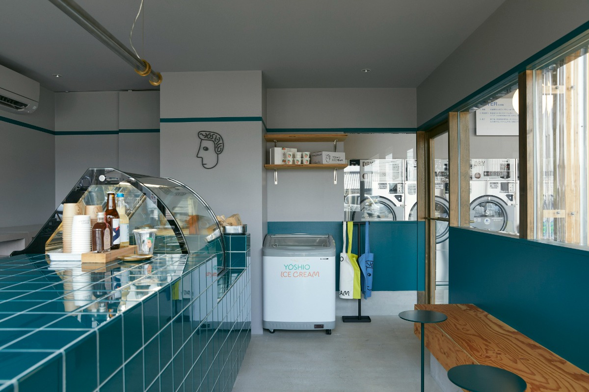 落ち着いた色合いでスタイリッシュな店内。店の奥にある「ヨシヲ」のロゴと一緒にアイスの写真を撮る人が多いそう。地元の良さを再発見してほしいという思いが詰まったアイスクリームの魅力に、遠方から足を運ぶ人も多い。