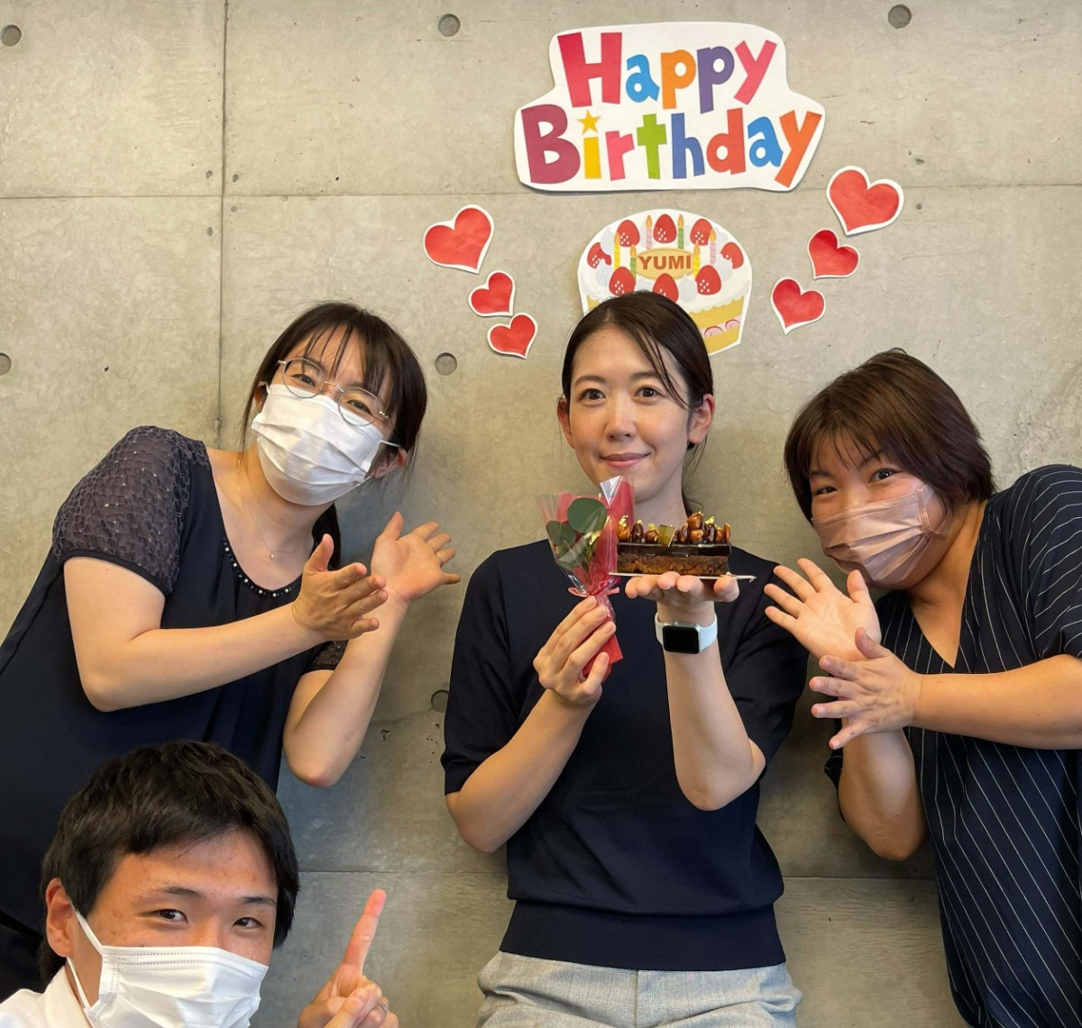 社内スタッフの誕生日にはケーキでお祝いすることも。また、登録スタッフの誕生日にはクオカードギフトを贈り、生まれてきたこと・出会えたことに感謝している。