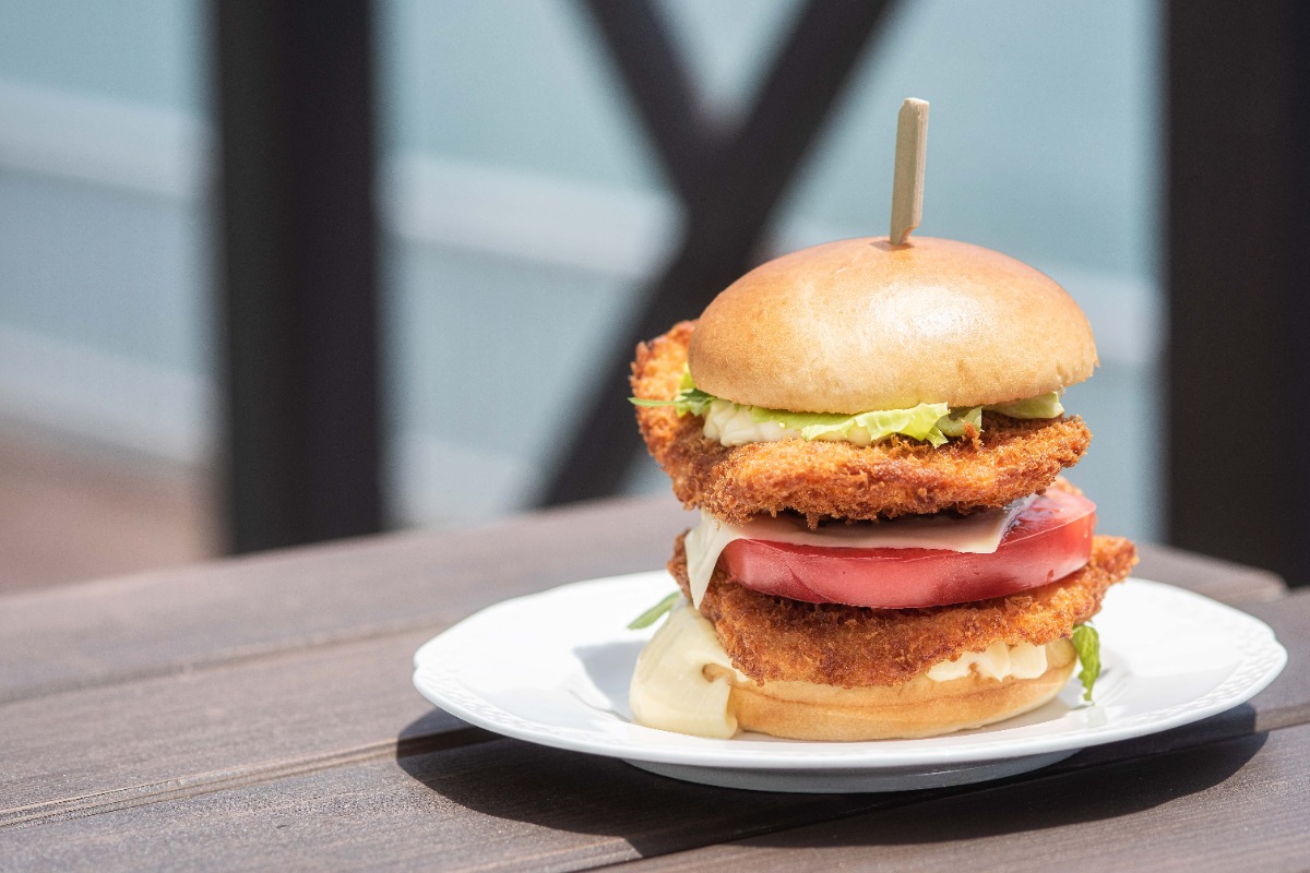 新発売の味も食べ応えも抜群の揚げたてダブル鯛カツサンド「多々羅バーガー」。「鯛カツバーガー」、「スパイシー鯛カツバーガー」と並び、フードコートで人気!