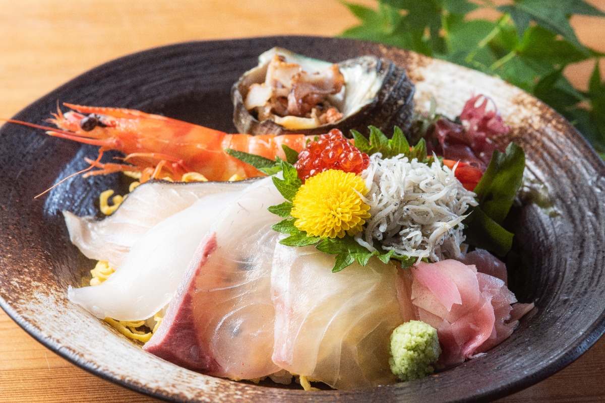 車海老や来島鯛、サザエをはじめ、旬の海鮮ネタが盛りだくさん。味噌汁・小鉢・漬物付き!
