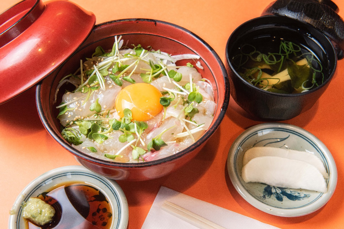 アジか鯛の刺身に、生卵とたっぷりの薬味を絡めて食べる漁師飯。吸い物のダシも海峡つゆを使用!