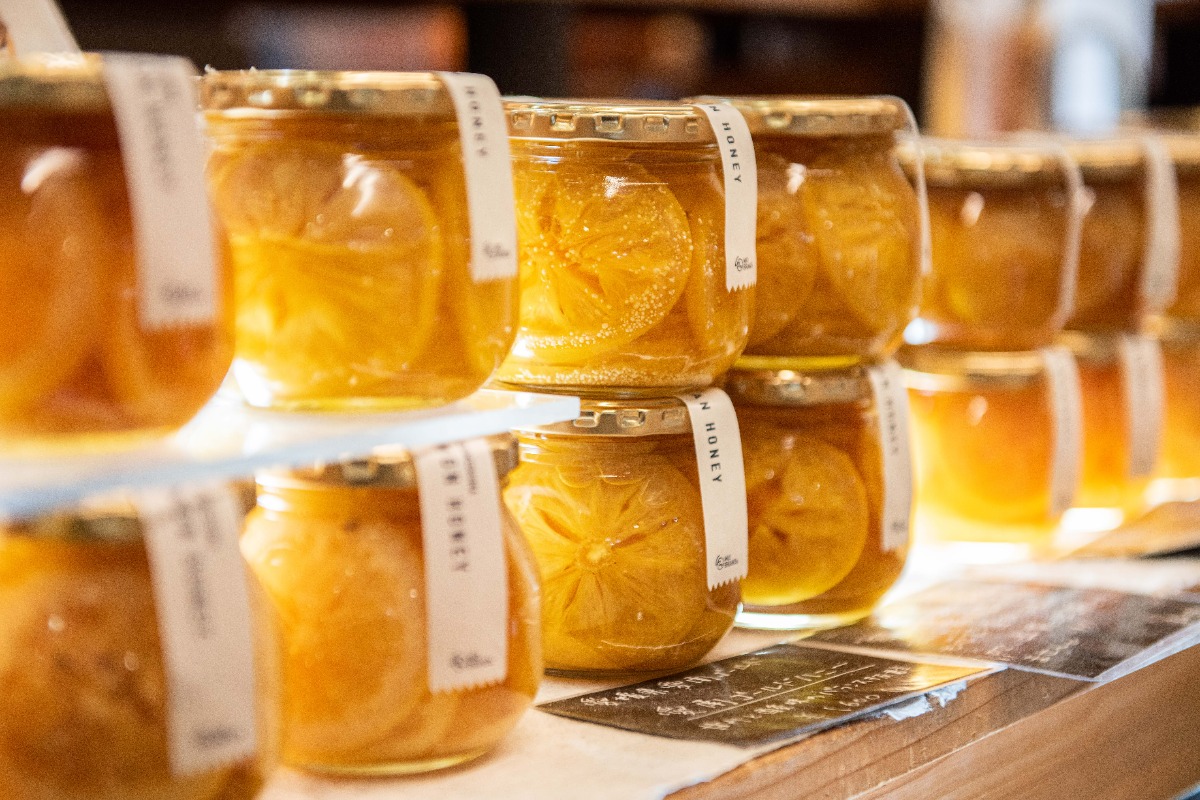 パケ買いしたくなる可愛さ!愛媛産フルーツの瓶詰め!大三島産レモンを愛媛産天然はちみつに漬け込んだ、くどくない甘さのはちみつレモン。