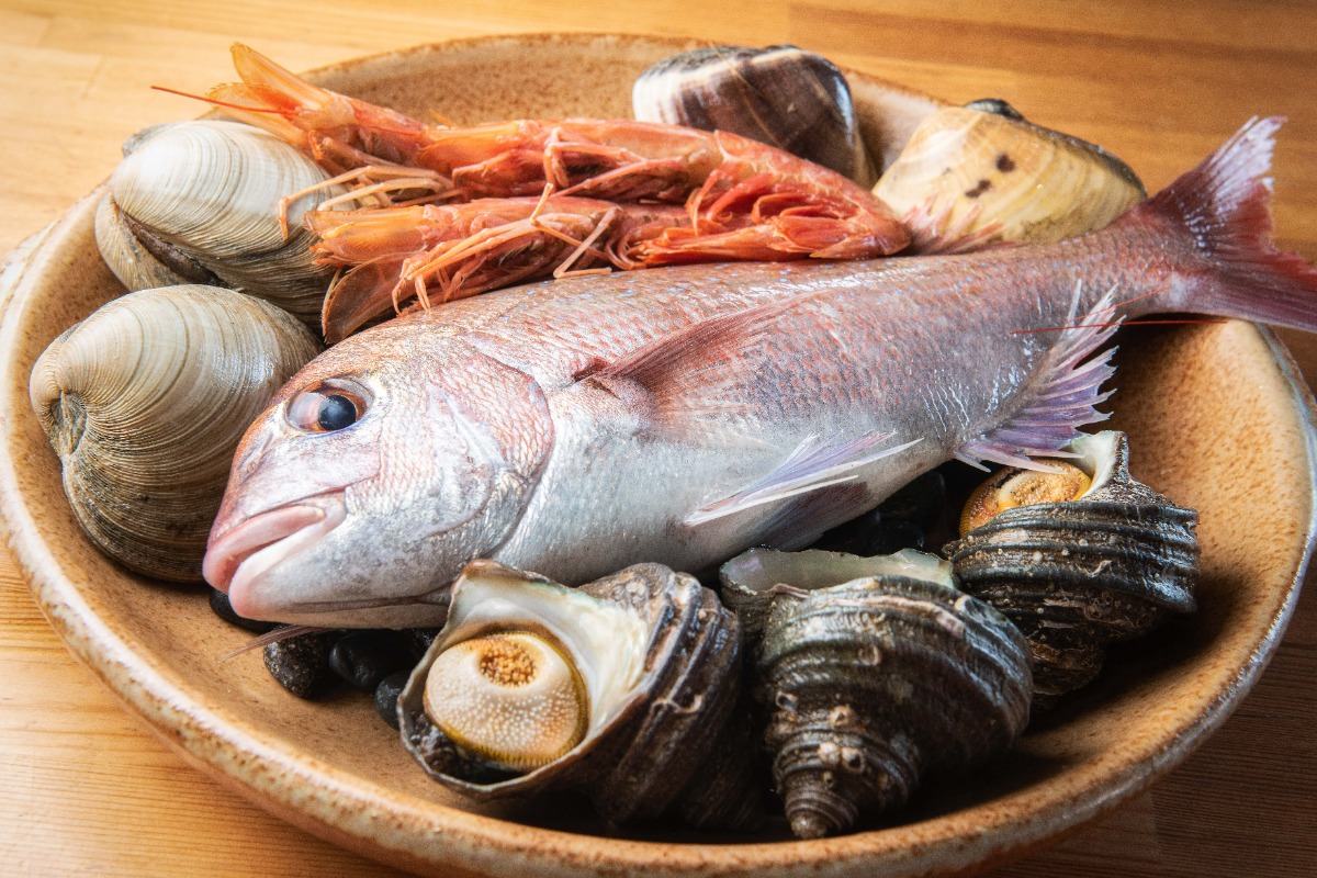 素材の旨みを存分に堪能!1日5組限定の新メニュー! 鮮魚コーナーで好きな魚介をチョイスするシステム。焙烙(ほうろく)鍋で蒸し焼きにする豪快な浜料理