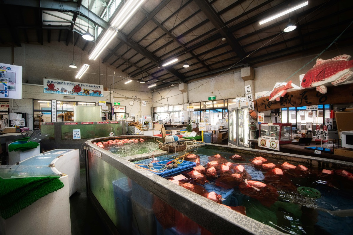 鮮魚販売コーナーでは自宅で手軽に海鮮焼きが楽しめる「カンカン焼き」セットの販売もしており、9月頃までは夏限定の岩牡蠣セットもおすすめ。土・日曜、祝日はじゃこ天の実演販売も実施。また、日本三大急潮流の一つとして有名な来島海峡の急流を間近で体験でき、来島海峡大橋の下をくぐり海上から橋を見上げたり、造船所群を湾内から見学したり、芸予要塞の砲台跡が残る「小島」や村上水軍の居城跡「来島」などをめぐる見どころ満載の体験型クルーズ「来島海峡急流観潮船」の乗船手続きの受付も館内にある。