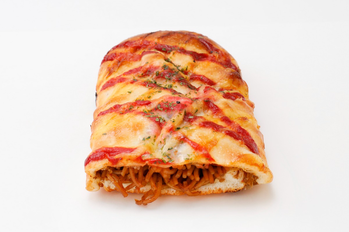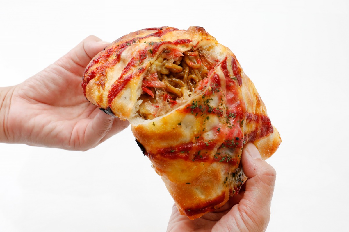 カルツォーネとは、ピザ生地で作る包み焼きパン。トマトやチーズなどイタリアンなフィリングが定番なのですが、なんと焼きそばが入ってます! 見た目のインパクト強し!