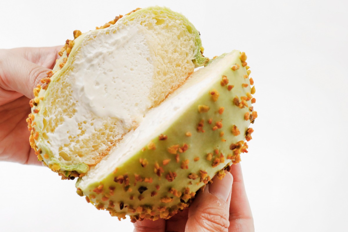 半分に割ってみると、ほら!ホイップクリームがた~っぷり! クリームはふわふわで、ピスタチオはカリカリ。食感が楽しいメロンパンです。食べた後もメロンの爽やかな風味が残りました!