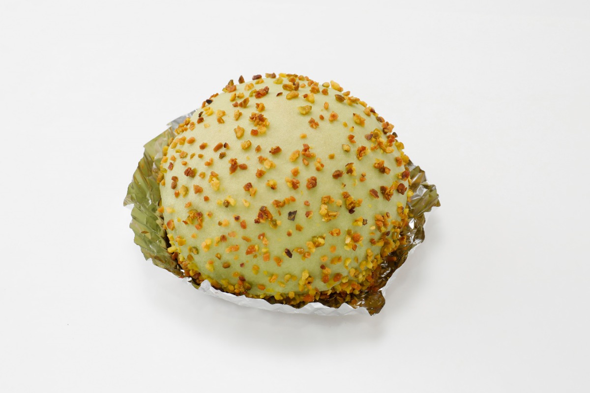 まずビジュアルにびっくり! なに?このイガグリ頭(笑)。つぶつぶの正体は、カリカリのピスタチオ! 黄緑の生地は、メロン風味のクッキー生地! 前にお店で提供していた「北のメロンパン」の進化系?