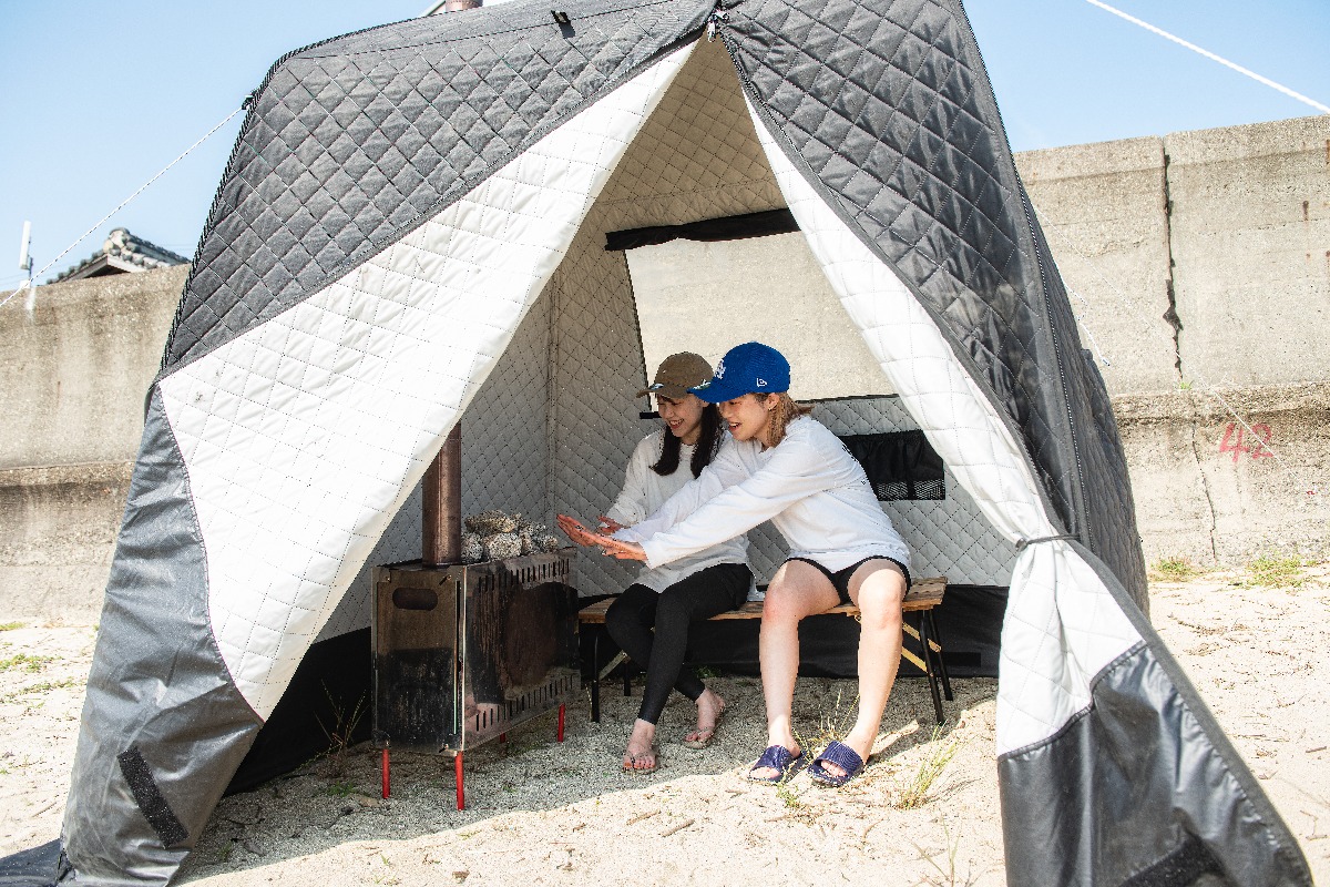 来島海峡を一望できる穏やかな空間で、マリンアクティビティやテントサウナなどのアウトドアが楽しめる。