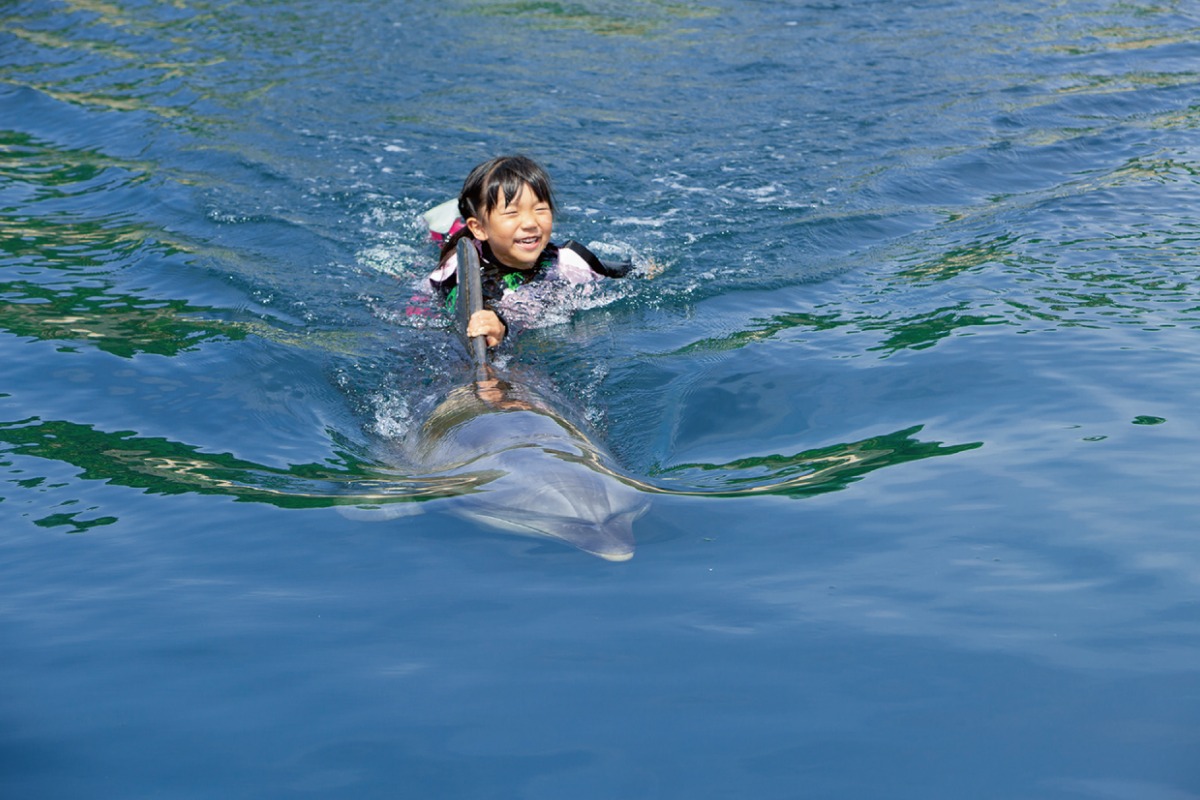 「スイムコース」ではイルカのヒレにつかまって一緒に泳いだり、近くで観察できて迫力満点!握手や餌やりができる「ふれあいコース」も有。イルカを見て、触って、一緒に泳いで楽しく生態を学ぼう!体験無しでイルカの見学も可能。