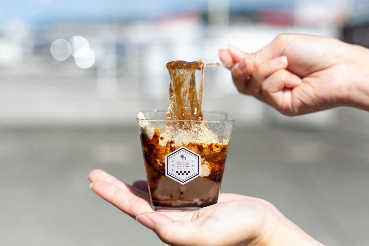 イチオシは作り立てが提供される「とろける極上わらび」。賞味期限はなんと1時間!できたての、温かくてよく伸びるうちに味わおう。この他にも一番人気わらび餅ドリンク「わらびっちゃ」(Mサイズ・550円)や白玉やういろうがのったドリンクなど、オリジナルの珍しいメニューがたくさん!蜜柑店限定や季節限定のメニューもあるので、愛媛ならではの味を堪能しよう!