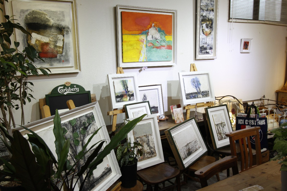 フランス在住の画家「Taka Mizukami」の作品や神戸の作家「森本陽子」の食器、アンティークジュエリーや北欧系の雑貨、船ケ谷町にある「HINOKI and the green」の植物、ギャッベやタペストリーなど、店いっぱいに店主チョイスの品が並ぶ。お気に入りを見つけたら購入して家でも楽しもう。