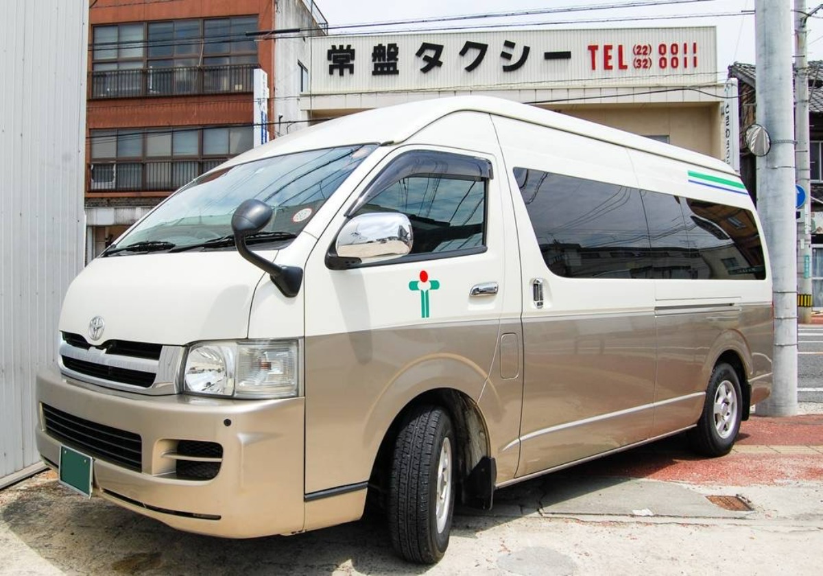 地元のことを知り尽くした専属ドライバーが、目的地まで送迎してくれる「ときわトラベル」のタクシー観光。人数によって車種が異なる(写真は5名以上のジャンボタクシー)。別途料金を支払えば松山市内まで送迎してくれる!