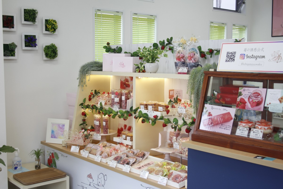 「THREE FISH COFFEE」のオーナーの知り合いである、香川県のイチゴ専門店「苺の誘惑」のスイーツを常時販売。パッケージまで可愛い焼き菓子は、贈り物にもぴったり!花が咲いたように盛られたイチゴが目を引く「苺のティラミス」もある。もちろんスリーフィッシュコーヒーのコーヒーやカバンなどのグッズも販売中!