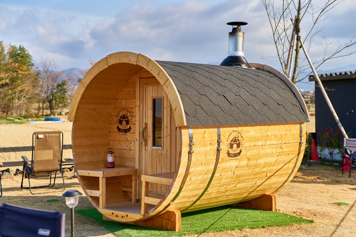 県内では珍しいロウリュもたっぷり楽しめる木製のバレル型サウナ小屋「ヘルシンキ」も◎!