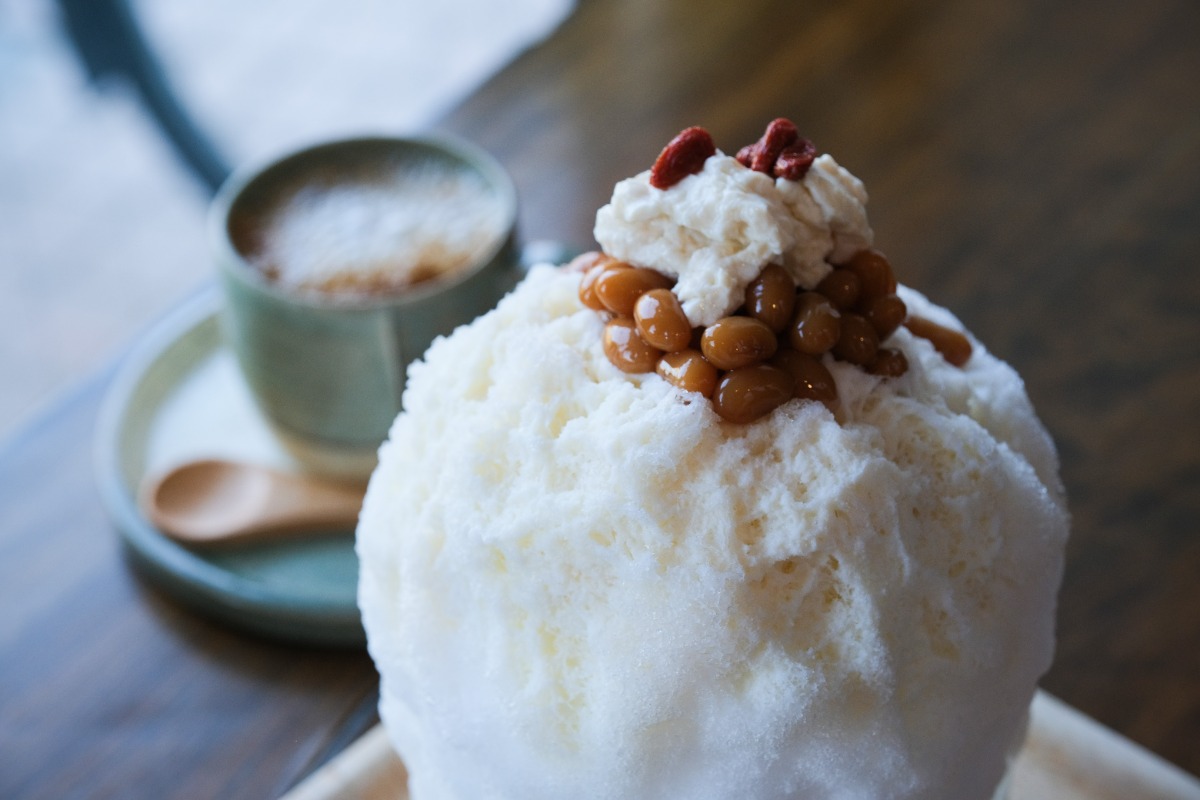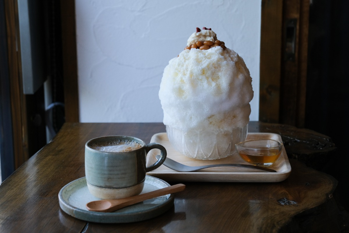 自家製の石臼豆腐と、てんさい糖で甘く炊いたぶどう豆をたっぷりのせた和風かき氷。氷は、石臼豆腐のなめらかな口当たりにマッチするように、ニキタツ製氷の氷を仕入れ、薄く削ることでふわふわとしたくちどけの良さを実現。優しい甘さのてんさい糖シロップをかけて召し上がれ。