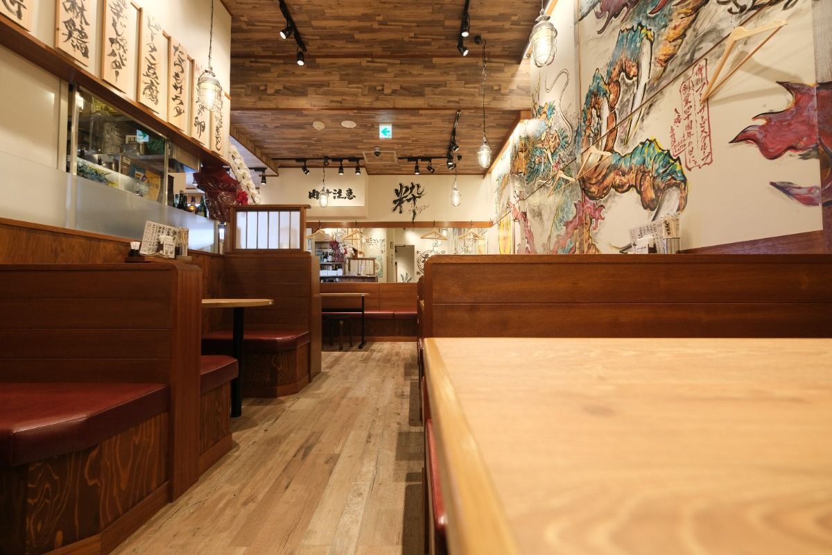 店内の壁に描かれた、ダンダダンの象徴ともいえるスタッフさんやデザイナーさんが描いた墨文字やイラストが大迫力!少人数で座れるテーブル席が多く用意されているので、一人利用もしやすい。大街道という好立地と、元気なスタッフさんのかけ声、餃子の焼ける香ばしい香りに誘われてくる人も多いそう。
