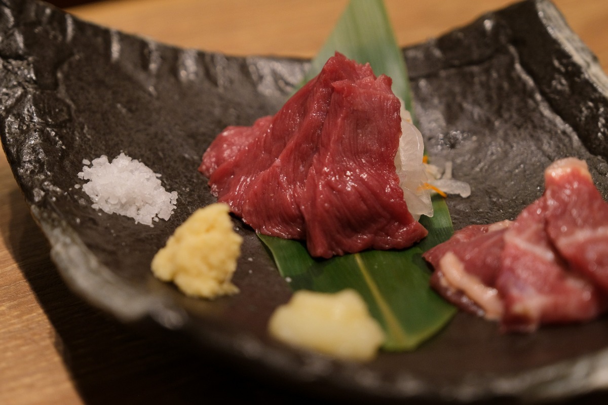 柔らかい食感の「赤身」と、弾力があり噛むほどに肉のうまみを感じる「バラひも」。薬味は岩塩・おろし生姜・おろしニンニク・九州の甘口醤油の4種類あり、スタッフさんのおすすめは甘口醤油!