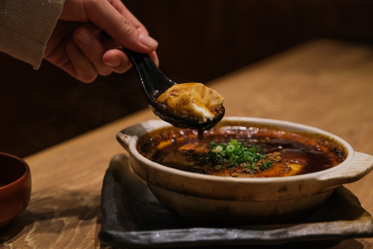 300gの豆腐が丸々入った麻婆豆腐は、見た目のインパクト大!ナツメグや山椒の入った「五香粉(ウーシャンフェン)」の香りが感じられる一品。