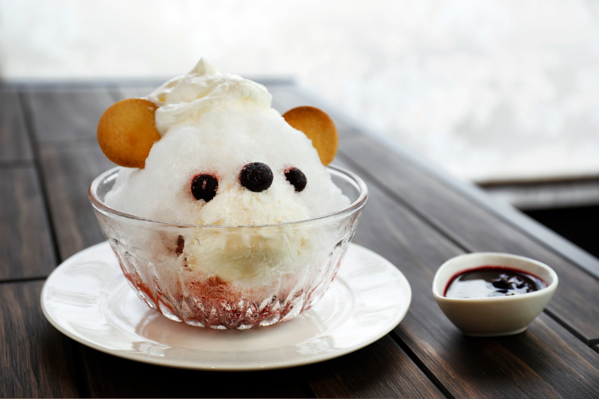 氷の中に入ったイチゴジャムやソース、トッピングのクマ型クッキーにいたるまで、すべて手作り。西条産生果のブルーベリーをあしらったかき氷にふわふわ帽子を被らせた愛らしい姿は、食べるのがもったいないほど。ブルーベリージャムは人気のグランパスツリーのジャムを使用。