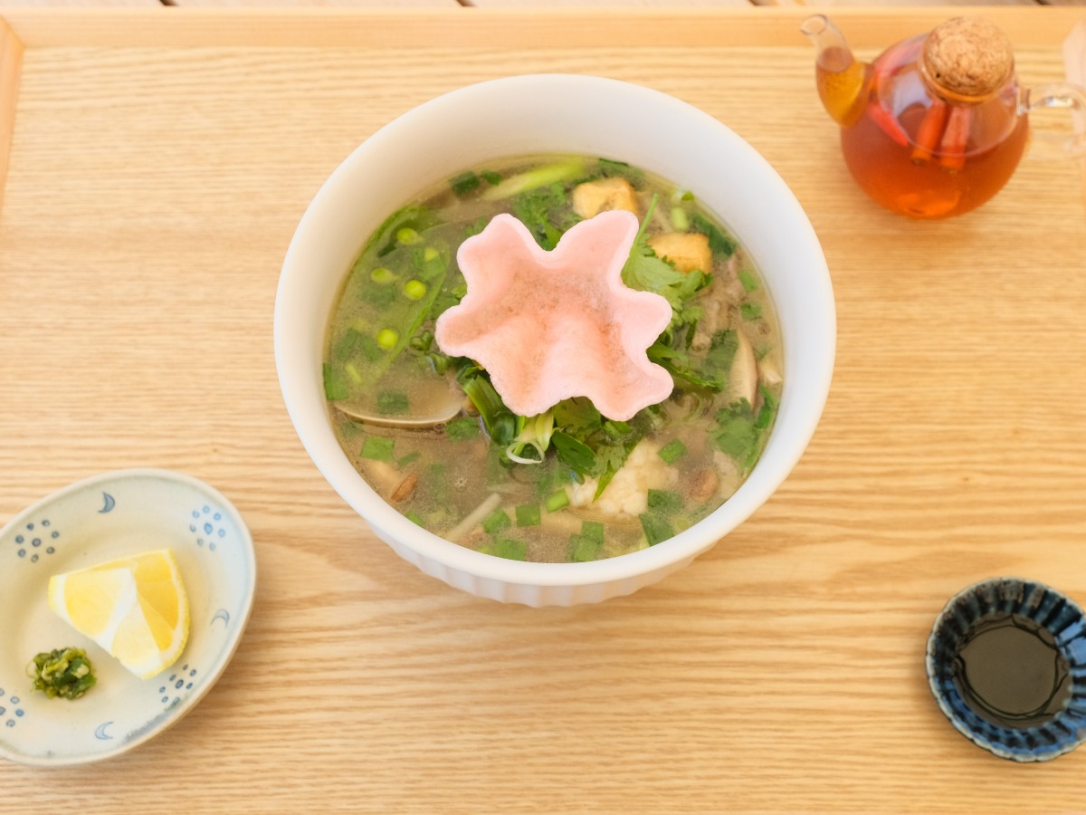パクチーの香りが異国を思わせる、「黒毛和牛のフォー」。レモンやフィッシュボールなど八幡浜産の食材も多く使われている。10種類のスパイスが入ったスープは、飲むと身体の内側からじんわり温かくなる。ショウガやニンニクの入ったソースやレモンなどで“味変”しながらどうぞ。