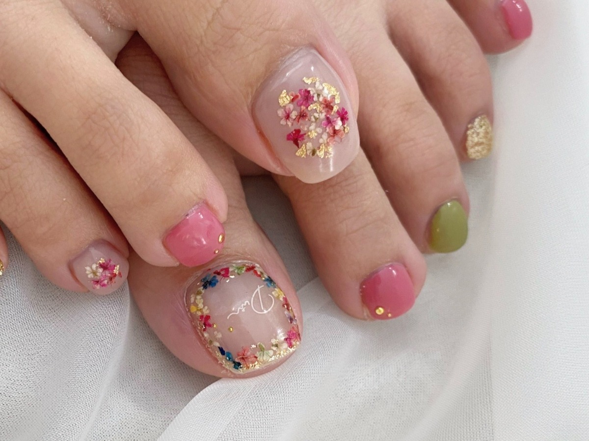 フットネイルも可能!これから夏に向けてサンダルを履く機会も増えるので、足までカラフルに彩ってみては。フットジェルメニューは、プラスで「かかとの角質処理」(1,500円)もできるため、隅々まで美容に気を配りたい人に嬉しい。