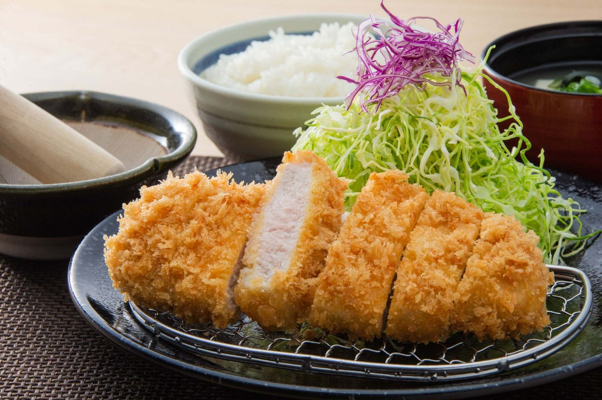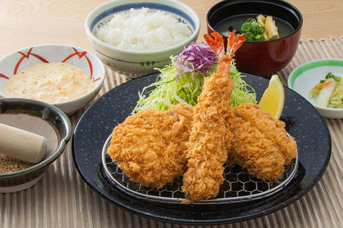 ロース60gと、ひれ1枚、大きな海老フライ1本がセットになった大満足の定食!