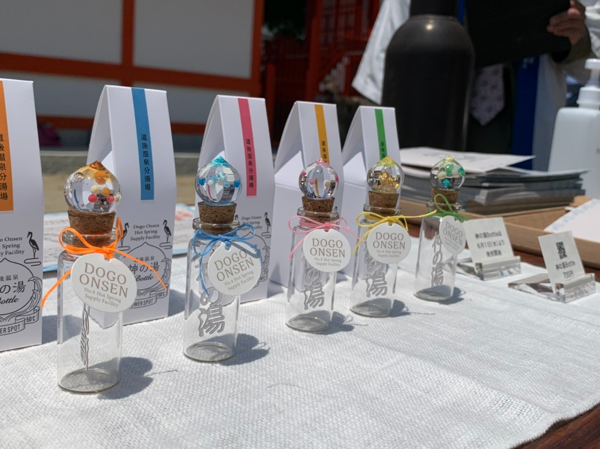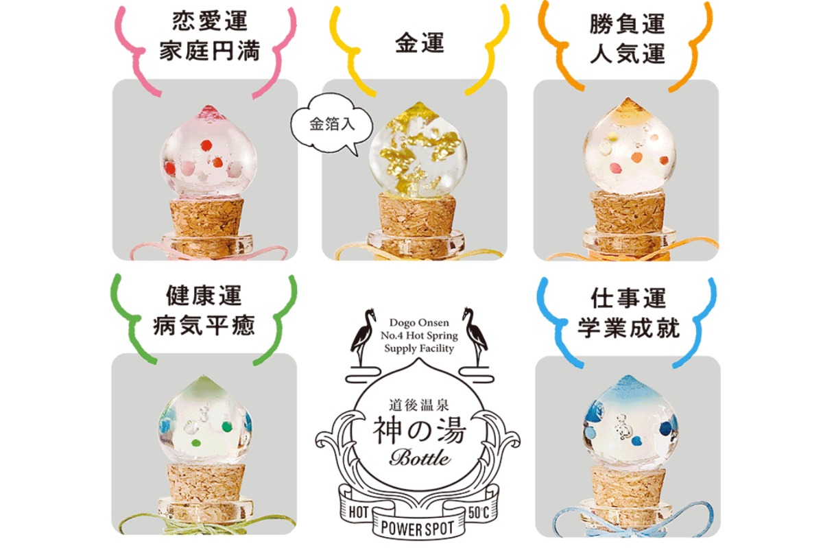 道後温泉開運めぐりのプロジェクトとして、2022年6月より発売となる新しい開運アイテム「神の湯Bottle」。道後温泉のご利益をコルク瓶に入れて持ち帰ることができます。湯玉の色にはそれぞれ意味がありますが、直感で選んだ色がイマあなたに必要なラッキーカラーかもしれません!