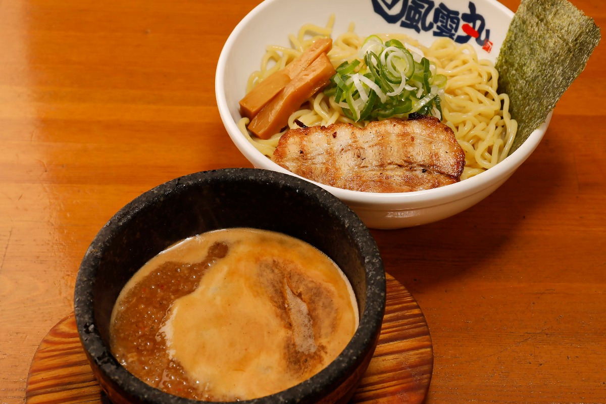 つけ麺専門店・風雲丸の看板メニュー「石焼濃厚つけ」。芳醇な豚骨スープに魚介の旨みを加えた超濃厚なスープに、加水率が高くのどごし抜群のもっちり太麺をつけて豪快にすするべし。麺は特盛600gまで無料サービスというのもガッツリさんには嬉しすぎる。残ったスープにごはんを入れて二度楽しむのも良し!