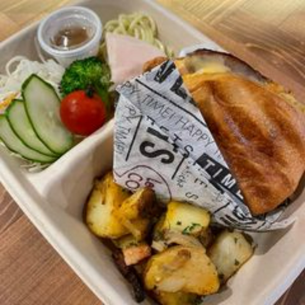 サンドがメインになったランチボックスは、サラダや付け合わせも付いて大満足の内容! 事前予約がおすすめ。他にもピザやパスタなどもテイクアウトOK!