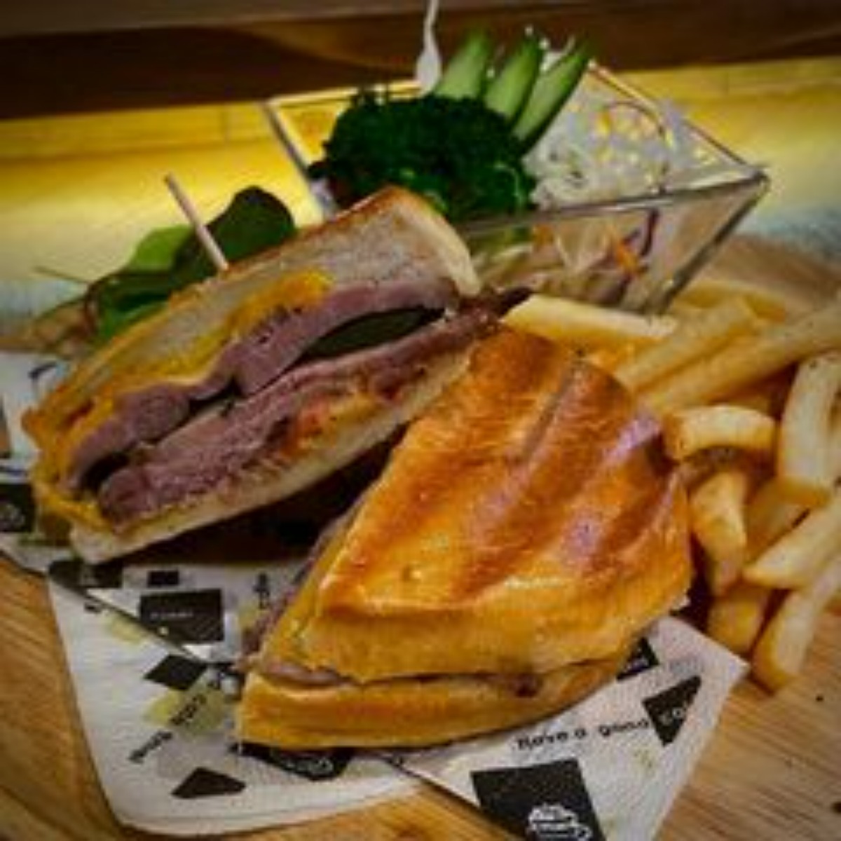 内子町で生産されている内子豚を使ったキューバサンド。サラダとデザート付き。