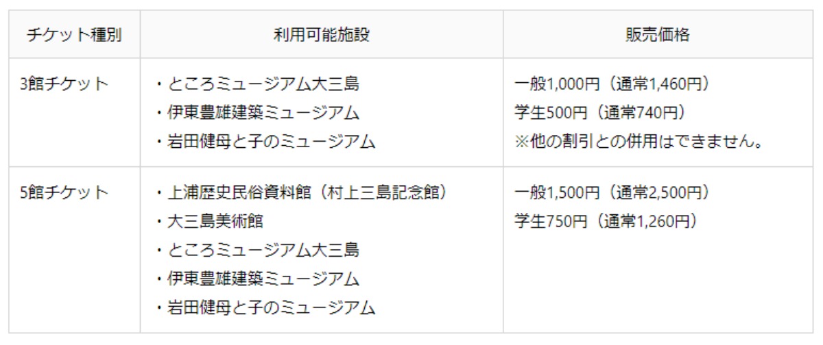 【5館チケット】(上浦歴史民俗資料館/村上三島記念館・大三島美術館・ところミュージアム大三島・伊東豊雄建築ミュージアム・岩田健母と子のミュージアム)一般1,500円、学生750円
