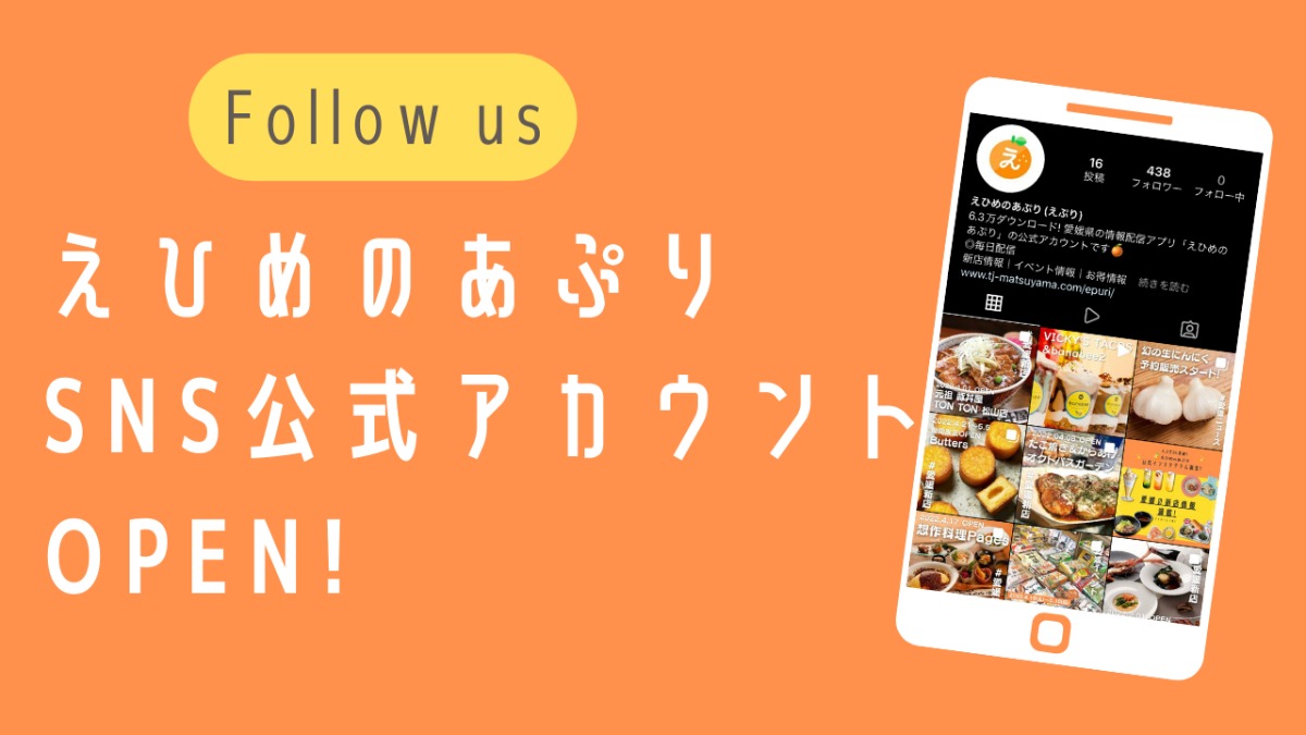 えひめのあぷりのSNS公式アカウントがオープンしました! 新店情報やイベント情報、お得なキャンペーン情報を発信していきます。えひめのあぷりに掲載されていないタイムリーな情報がアップされることも!? ぜひフォローをお願いします♪