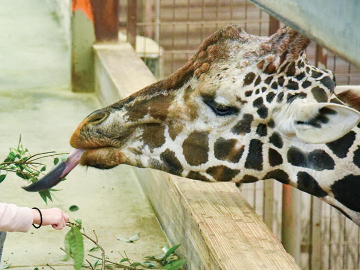 普段は入ることのできないキリンの寝室(2階)で、キリンを間近に観察しながらエサやり体験ができる。チケットは1枚300円、各回10名限定(チケットは1人1枚必要)