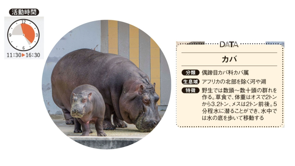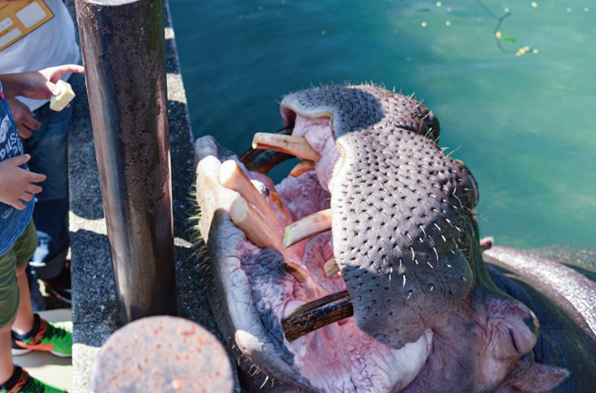 普段は入れないエリアでカバを間近に観察しながらエサやり体験ができる。まんぷくが近くで見られたらラッキー! チケット1枚300円、エサ3個、6名まで。15組限定。